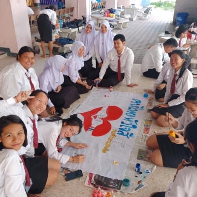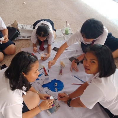 บรรยากาศการเขียนป้ายผ้ารณรงค์ต่อต้านยาเสพติดของนักเรียนนักศึกษา เนื่องในวันต่อต้านยาเสพติดโลก ซึ่งจะจัดขึ้นในวันพุธที่ 26 มิถุนายน 2562 นี้