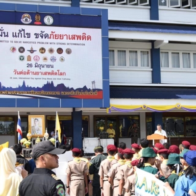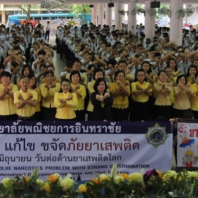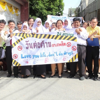 งานโครงการพิเศษและการบริการชุมชน ฝ่ายพัฒนากิจการนักเรียน นักศึกษา ได้จัดกิจกรรม รณรงค์วันต่อต้านยาเสพติดโลก คำขวัญ วันต่อต้านยาเสพติดโลก คือ มุ่งมั่น แก้ไข ขจัดภัยยาเสพติด ณ บริเวณชุมชนทรัพย์สินใหม่ เขตวังทองหลาง